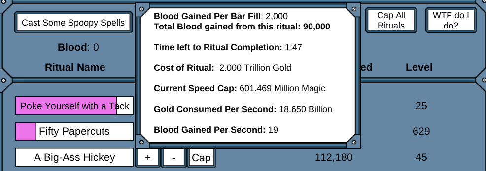 Once you unlock Blood Magic, you will likely be at the point where you have enough magic to consume all of your money. Here, papercuts yield 5 Blood Per Second (BPS) and consumes all my money. The hickey yields 20 BPS, but will never trigger because the papercuts trigger earlier and consume all the gold.