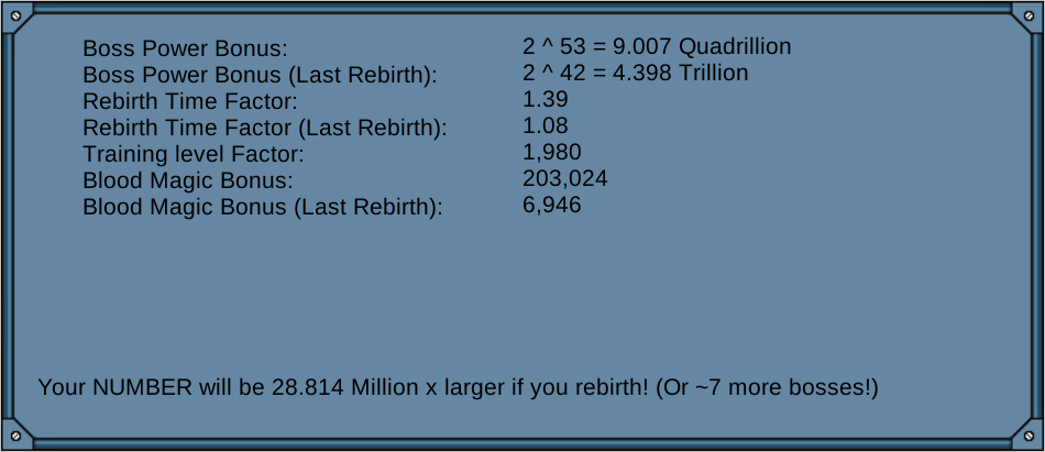 In Blood Magic, we have multiple methods by which to contribute our blood and magic into a multiplier for our NUMBER which determines how much EXP/t we can get in our next life.